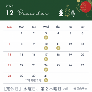 12月は毎週水曜日定休と別に11日木曜日を店休日とさせていただきます。